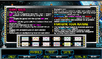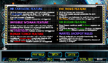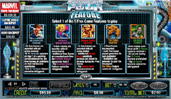 - Fantastic Four Feature Game: The 'Fantastic Four' feature is triggered when 3 or more scattered logo symbols appear anywhere in view. The game screen will change, and the feature game screen will open up to select 1 of the 5 free game features to play, which will award free spins. On completion of the 'Free Spin' feature, the main game screen is restored.