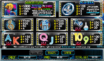 - “Mr Fantastic”, “The Invisible Woman”, “The Human Torch”, “The Thing”, “Dr Doom” appear on Reels 1, 2, 3, 4 and 5 respectively and substitute for all symbols except “Scattered Logo”