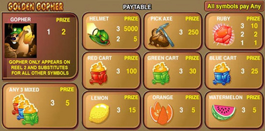 Golden Gopher er en tre-hjuls spilleautomat med fem betalingslinjer. Spillet indeholder også et joker-symbol. Jordegern-symbolet findes kun på hjul 2 og kan erstatte alle andre symboler.