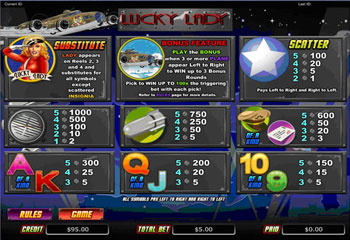 Lucky Lady er en femhjuls-spilleautomat med tyve betalingslinjer med et "Lucky Lady"-bonusspil. Lucky Lady"bonusspillet får du kun, når der vises 3 eller flere flysymboler et eller andet sted fra venstre mod højre. Lucky Lady-symbolet træder i stedet for alle andre symboler, bortset fra det spredte flysymbol.