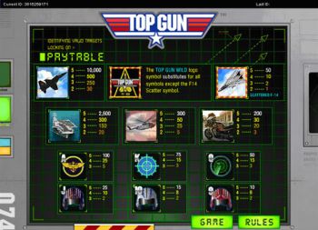 Top Gun er en femhjuls-spilleautomat med 20 betalingslinjer og en ’gratis spin’-funktion, der udløser yderligere spin, samt et temaspil som bonusrunde, der giver dig chancen for at vinde ekstra præmier. Spillet indeholder også et Top Gun-jokersymbol. Top Gun-jokersymbolet træder i stedet for alle symboler undtagen det spredte F14-symbol. Top Gun-temaspillet udløses af tre eller flere spredte F14-symboler. Gratis spin-funktionen aktiveres tilfældigt, når et jetfly flyver over hjulene.