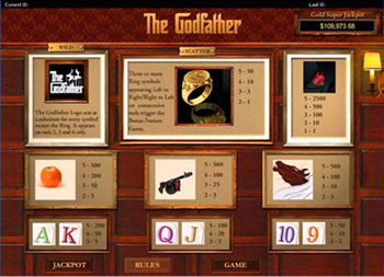 Godfather is a five-reel, twenty-payline 'Gold Jackpot' slot game with a 'feature' game that gives you the chance to win extra prizes. The game also features a wild symbol, The Godfather. The Godfather symbol appears on reels two, three and four only and substitutes for all symbols other than the scattered Gold Ring symbol. For each bet placed, the house adds a percentage of the bet amount to all the four running Gold Jackpots.