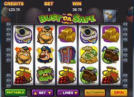 Bust Da Safe slots is a five-reel, 20-payline slot game, with a feature game Bust Da Safe and free spin games that allow you to win more than a normal game. The Bust Da Safe symbol appears on all reels and substitutes for the Goldbag and Goldbar symbols to make a winning combination.