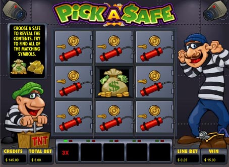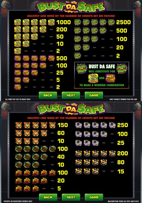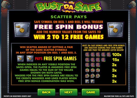 - Bonus feature game: Bust Da Safe bonus feature game is triggered when three or more images of Short Thief, Tall Thief or the Money House appears anywhere in any combination. The game screen will change and the bonus game screen will open up. The main game screen is restored to its previous state once the bonus game has been completed.