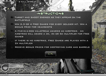 - CALL OF DUTY 4 feature: When three or more Scattered Logo symbols appear anywhere in view, the Call of Duty 4 Feature is awarded. The player is taken to a battlefield feature screen. Enemies should be targeted and shot as they appear on the battlefield. 2, 3 or 4 free games are awarded for each enemy hit. Bonus prize are awarded for headshot hits. If the player has a killstreak of 5-in-a-row, he/she is awarded with an airstrike. The airstrike awards a free game multiplier of 3, 4 or 5. If an airstrike does not occur, then there is a free game multiplier of 2. The free games will begin when the mission is complete.