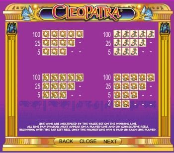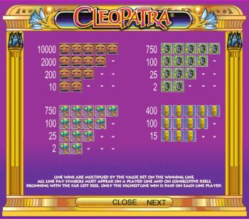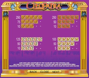 - If 'Cleopatra' substitutes a symbol to make a win, the win amount for that symbol is doubled.