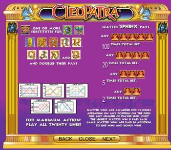 Cleopatra Slot is a five-reel, twenty-line slot game with a free spin feature. The game also features a "Cleopatra" wild symbol which substitutes for all symbols except the "Sphinx" scatter symbol. Three or more scatter symbols anywhere in view triggers the free spin feature in which all wins except 5 'Cleopatra' wild symbols are tripled.