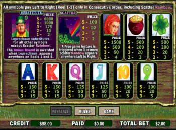 - During a round match any 3 of the same symbol – Leprechaun, Girl, Pot of Gold, 4 Leaf Clover or Rainbow and win the prizes as mentioned below.