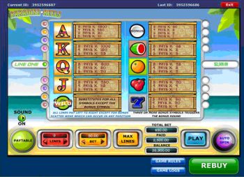 Paradise Reels is a five-reel, nine-line slot game with a coconut shy bonus feature. You get to pick a random number of coconuts accumulating cash prizes for each coconut. 3 coconuts scattered anywhere in view triggers the bonus feature.