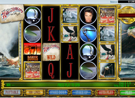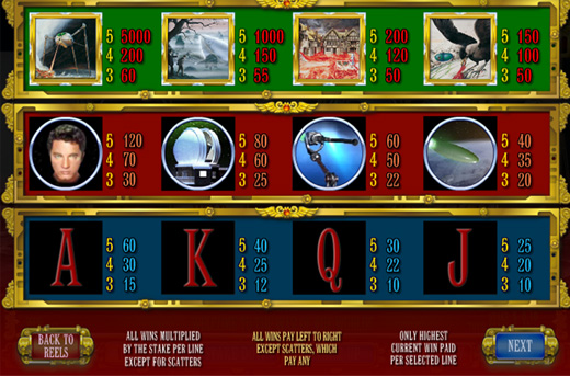 Jeff Wayne's Musical Version of The War of The Worlds is a 5-reel 100-fixed.line slot machine, with each reel being 4 symbols tall. In addition to a bonus round (where winnings are awarded for damaging and destroying the Fighting Machines), the game features special Wild symbol which react together to fill a reel with wilds. The Fighting Machine bonus game is a special bonus win, triggered by getting 3 BONUS symbols anywhere on the reels 1, 3 and 5 (one on each)
