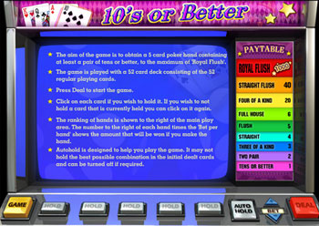 Tens or Better Video Poker game is played against the machine. It is a 1 hand Video Poker game and the objective of the game is to obtain a five-card poker hand containing at least a pair of 10's or better, to the maximum of Royal Flush. See the 'Paytable' below for more details. You place a bet and the machine gives you five initial cards. You then choose the cards you want to hold and the cards you want to discard. When you click on “DRAW” the machine replaces the cards you discard. You win according to the rank of your hands.