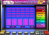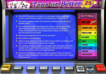 Tens or Better 25 hands Video Poker game is played against the machine. It is a 25 hand Video Poker game and the objective of the game is to obtain a five-card poker hand containing at least a pair of 10's or better, to the maximum of Royal Flush in as many of your 25 hands as possible. See the 'Paytable' below for more details. You place a bet and the machine gives you five initial cards. You then choose the cards you want to hold and the cards you want to discard. The machine then holds the same cards in each of other 24 "mini-hands". When you click on "DRAW" the machine replaces the cards you discard in each of your 25 hands, using a fresh deck on every hand. You win according to the rank of your hands.