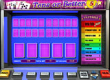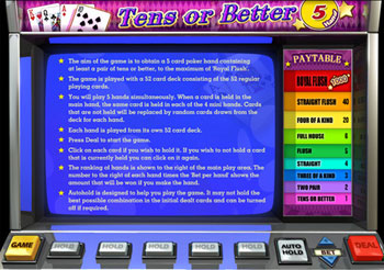 Tens or Better 5 hands Video Poker game is played against the machine. It is a 5 hand Video Poker game and the objective of the game is to obtain a five-card poker hand containing at lease pair of 10's or better, to the maximum of Royal Flush in as many of your 5 hands as possible. See the 'Paytable' below for more details. You place a bet and the machine gives you five initial cards. You then choose the cards you want to hold and the cards you want to discard. The machine then holds the same cards in each of other 4 “mini-hands”. When you click on “DRAW” the machine replaces the cards you discard in each of your 5 hands, using a fresh deck on every hand. You win according to the rank of your hands.